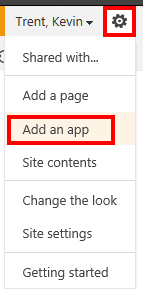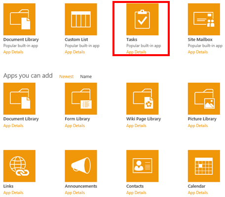 Once you have all of your lists, the first thing is to add the Task App to your SharePoint team site. Logon with an account that has enough permissions to add an app. In the upper right of the browser will be a gear icon, click it and choose “Add an app”. Then click the icon for tasks and enter a name. This is the name your team will see in Outlook so choose carefully.