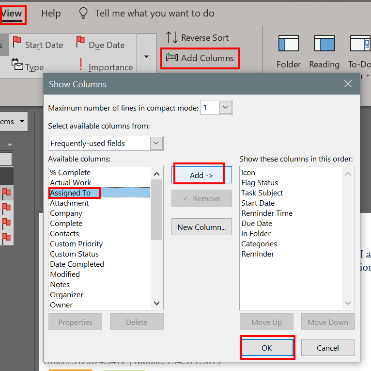 Add colums to your Outlook tasks to adjust the information you see, for example the afore mentioned “assigned to” column is not displayed in Outlook by default.