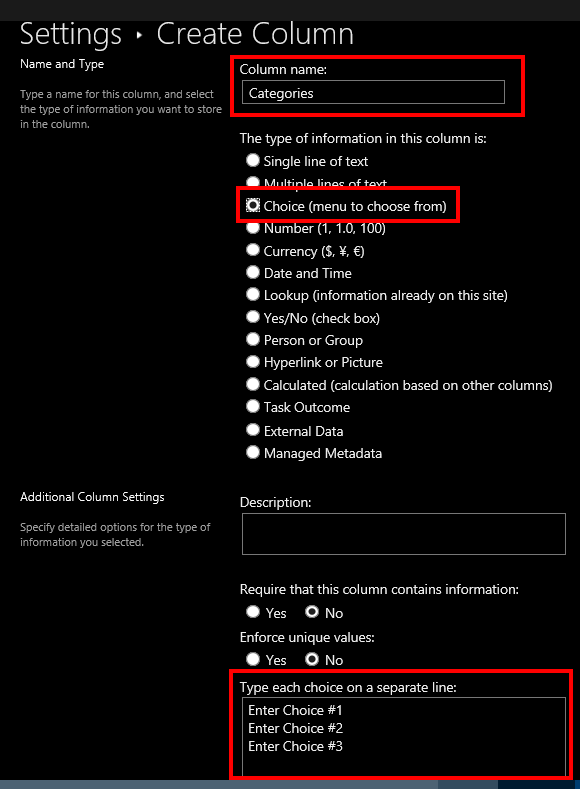 About half way down the page select the Create Column link. Name the new column Categories, set the type to choice, and enter you desired categories into the choice list’s box. Copy the categories you’ve create when you are finished and send them to your team. They will need to create the same categories in their Outlook tasks list in order for the syncronization to work.