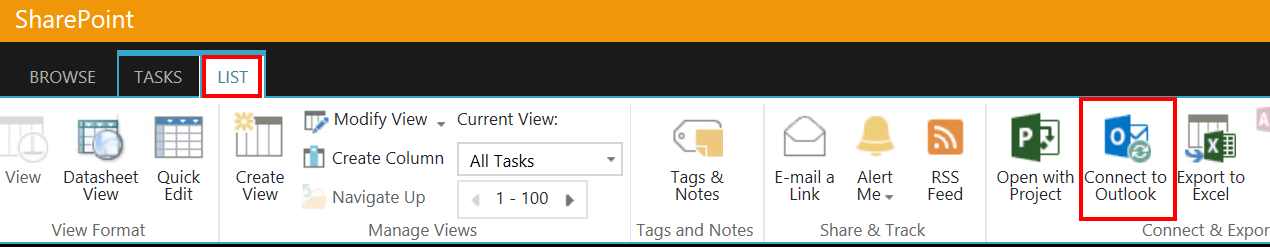 Once you get the PST situation squared away, each memeber on your team will need to visit the task list in their browser and then use the “Connect to Outlook” button in the list’s ribbon. If this button is greyed out, there are several SharePoint settings that could be the cause. Ask your SharePoint administrator to give you a hand. If you are the SharePoint administrator, try reverting to classic Exchange integration (google it), or enabling data export for the site/list.