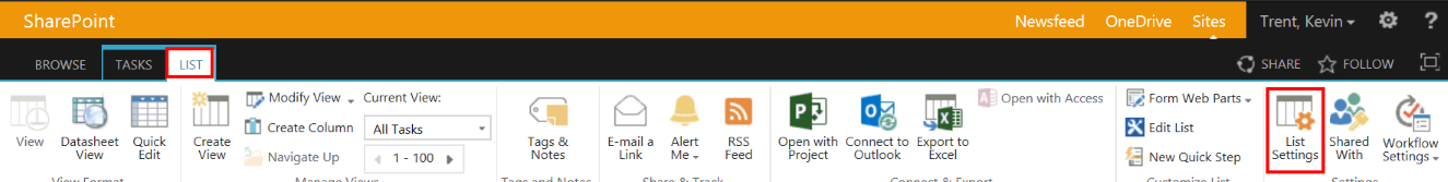 If you check the properties of your new task list (use the SharePoint ribbon), you should see that the column names match the field names of the Outlook task list. Look closely and you may notice an important one that is missing; SharePoint does not have a “categories” column. Most teams and managers will probably want to organize their work by categories; fear not, we just need to add the missing column.