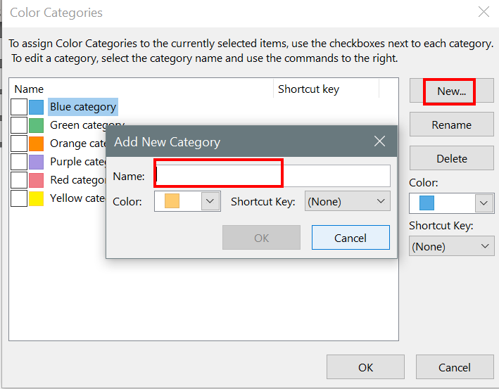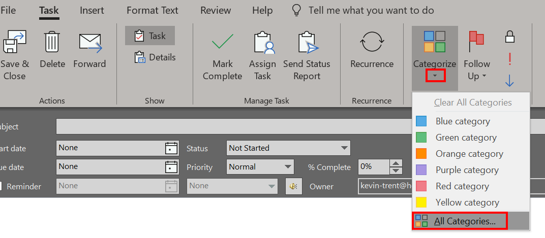 Once they get their email, they will need to open Outlook and create matching categories. The process varies a little in all of the different versions of Outlook, but in general, you create a new task and click the drop down under the categories button in the ribbon. Followed by clicking All Categories.