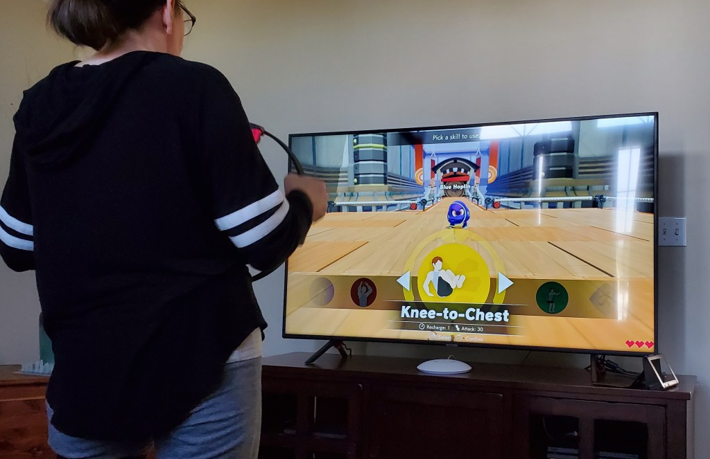 As the ring is stretched, pulled, rotated, raised and lowered, the changes in its shape and location are detected by the motion sensors. The same is true for the leg strap. The pitch, position, and angle of the controller strapped to your thigh is translated into movement. The design is pure genius, but it isn’t the hardware that makes the Ring Fit special.