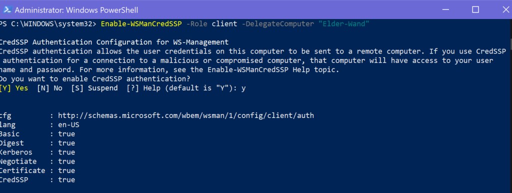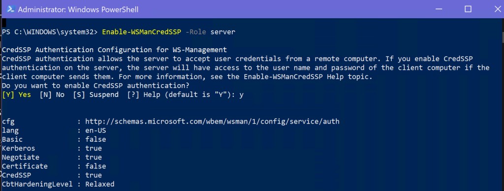 Now configure your workstation as a CredSSP client. In the same PowerShell console run: Enable-WSManCredSSP -Role client -DelegateComputer “fqdn-of-hyper-v-host” Depending on the current configuration of your workstation, you may have to respond with a “Y” to multiple prompts to complete this process.