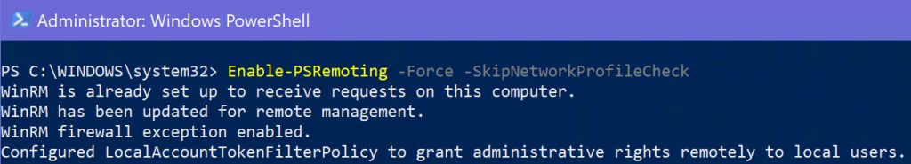 Now we’ll need to configure the Hyper-V hosts to allow the remote management connections. If you intend to control a multi-host cluster perform the following steps on each node. First open an elevated PowerShell console and run: Enable-PSRemoting -Force -SkipNetworkProfileCheck