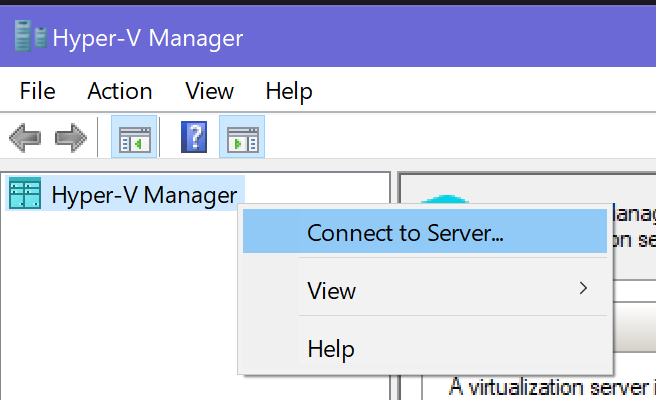 The configuration is done. Now all that is left is to connect the Hyper-V Manager. Open it from your workstation’s start menu and right-click on the Hyper-V Manager header in the left menu. Then click Connect To Server.