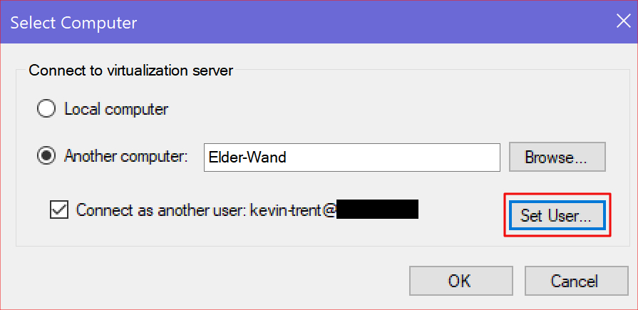 Enter the name of the Hyper-V host you wish to connect to and then use the Set-User button to specify your credentials. Click the OK button.