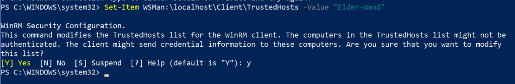Now you’ll need to configure your workstation to send delegated credentials. Open an elevated PowerShell console and run: Set-Item WSMan:\localhost\Client\TrustedHosts -Value “fqdn-of-hyper-v-host” Depending on the current configuration of your workstation, you may have to respond with a “Y” to multiple prompts to complete this process.