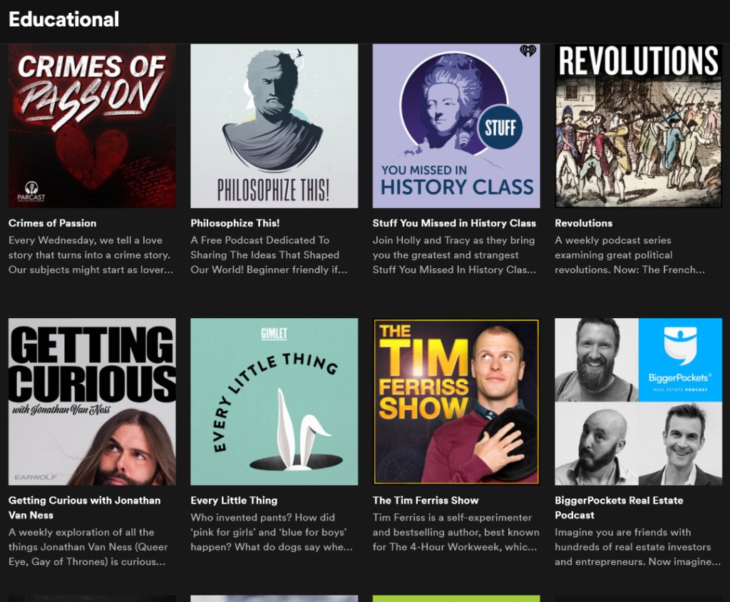 There are thousands of Podcasts from experts and Ivy league colleges that cover every subject under the sun. Some are broadcasts of actual classes. Others are discussions between multiple experts in any given field. Just browse the Educational section of your favorite Podcast app. Don’t forget, both Spotify and iTunes have Podcast support built-in.