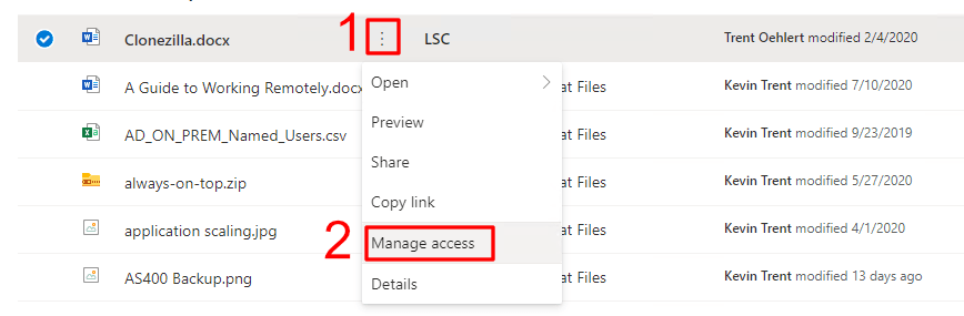 Click the icon at the end of the file that you want to stop sharing. Then click on Manage Access from the menu that appears.