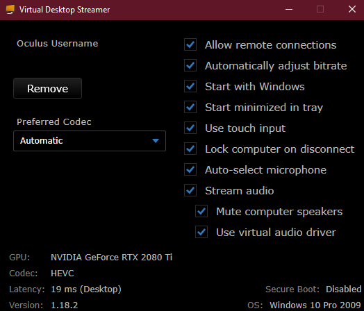 You will also need to download and install the VR streamer application for the Virtual Desktop software onto your PC and provide it with the Facebook account name that you setup in your Quest. In general you will want to select all the boxes in the application’s configuration screen.