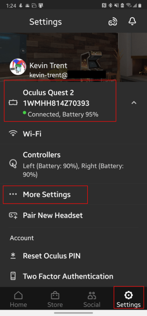 Now we need to enable developer mode on your headset. Open the Oculus app on your phone. Tap on your headset to connect to it, then tap the settings button in the bottom right. In the menu that appears, tap on more settings, then tap developer mode and the slide the setting to on.