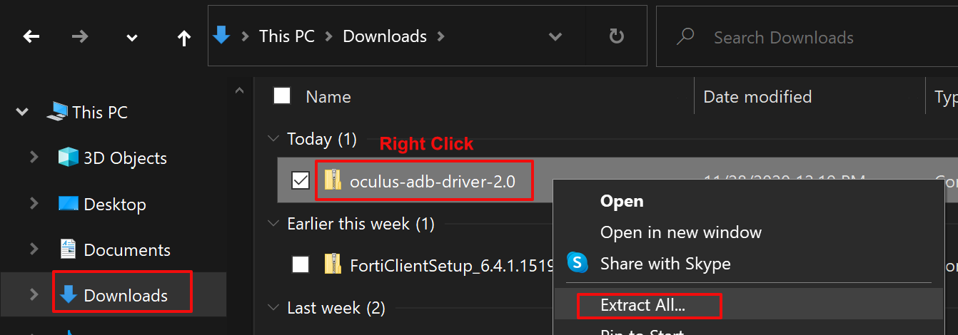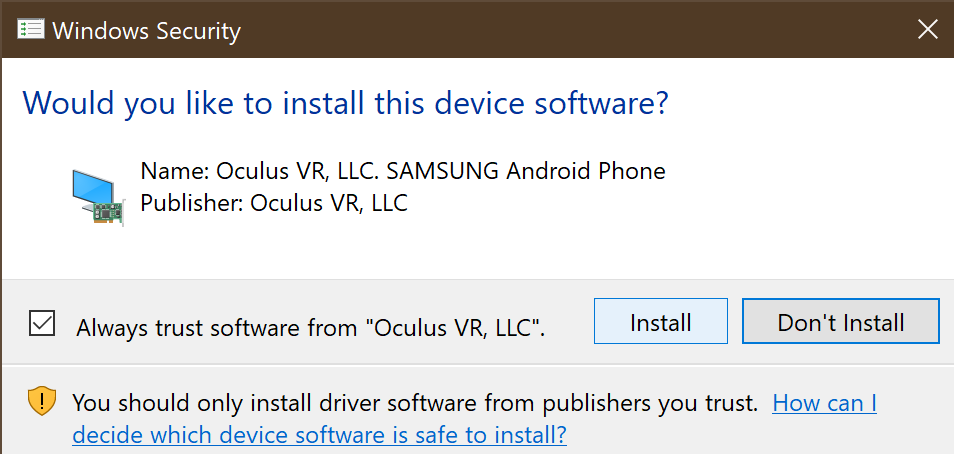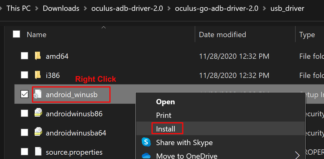 Now you’ll need to download and install the Quest ADB Drivers. On your PC, go to Oculus ADB Drivers | Developer Center | Oculus click the “I agree to the terms….” box and hit the download button. Open Windows Explorer and find the the downloaded file. Right click on it and choose Extract All from the menu then click the Extract All button. A new window should open, double click the “oculus-go-adb-driver-2.0” folder, then the “usb-driver” folder. Right click on the file named “android_winusb” and click Install from the menu. On the next screen click the Open button, then click Yes, then click Install.