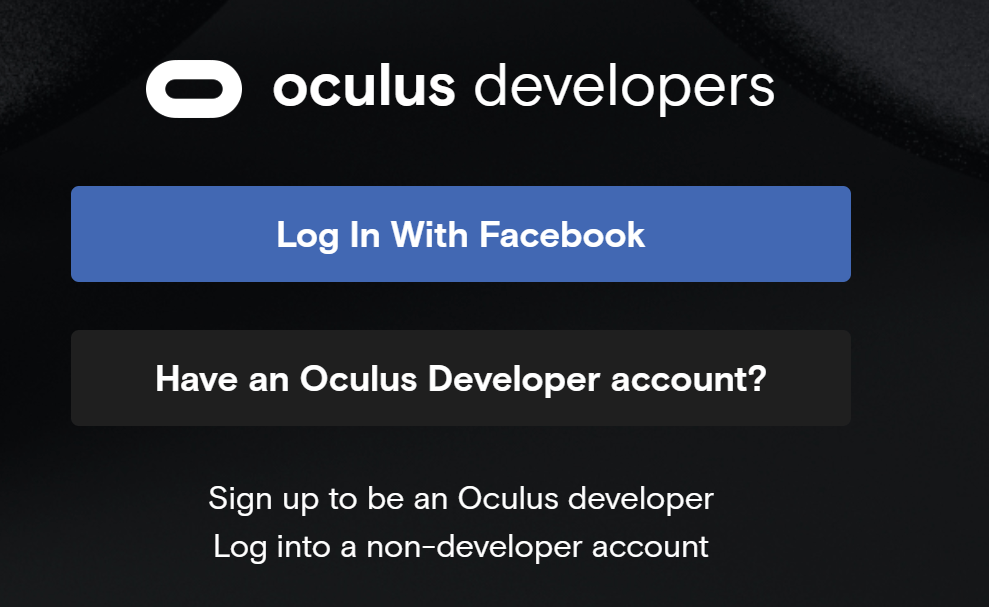 At this point you should be able to open the Virtual Desktop app in your headset and use it to access and control your desktop. To gain the ability to stream VR games we will need to install the add-on that the Virtual Desktop developer releases for free. The add-on gets side-loaded onto the Quest headset. To side-load applications you’ll need a developer account, don’t worry its free and easy. Go to Oculus Developer Dashboard and sign-in with your Facebook account. Provide any unique organization name that you like and accept the agreement. Should you ever publish an Oculus store app, the name you pick here will be shown in the store.