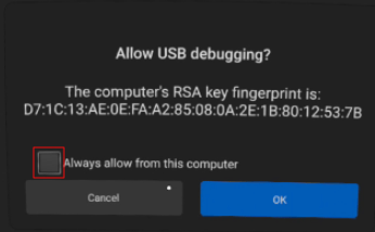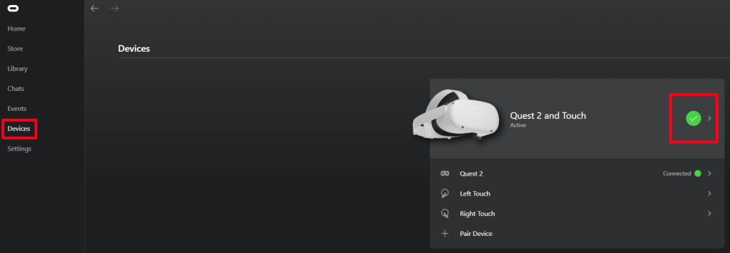 Now we are ready to connect your headset to your PC via the USB cable that came with it. Put your headset on and select a stationary boundary. You will be presented with a prompt to allow your PC to access content via the USB cable, accept it. Then another prompt asking to enable USB debugging will be shown, check the box that says to always allow from this computer and accept it as well. Do not enable the Oculus Link option if you are prompted to. Remove your headset (leave it connected) and the top right of the SideQuest app should show a green dot along with the name of your headset. If it doesn’t, you probably missed one of the security prompts, unplug and try again.