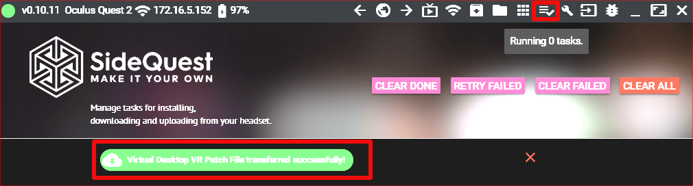 In the SideQuest app on your PC (with your headset still connected). Search or browse for Virtual Desktop. Click the Install To Headset button and watch for the message that the install task has been completed at the bottom. You can also use the task manager icon on the toolbar to verify the install has completed. When the install finishes, unplug your headset and close SideQuest.