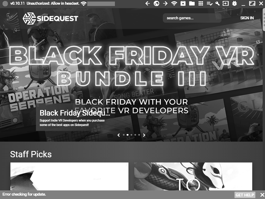 SideQuest is a 3rd party app store for your Quest headset. The Virtual Desk add-on is published here and that makes installing it much easier. In addition, there are lots of games and apps for your headset that are not available in the Quest store and many of them are free. On your PC head over to SideQuest (sidequestvr.com) download and install the software. You’ll notice they have an installation guide on the download page, you have already completed those steps, but it is a good idea to double check everything. Open SideQuest when the install finishes. You’ll notice that is says it can’t connect to a headset. This is normal.