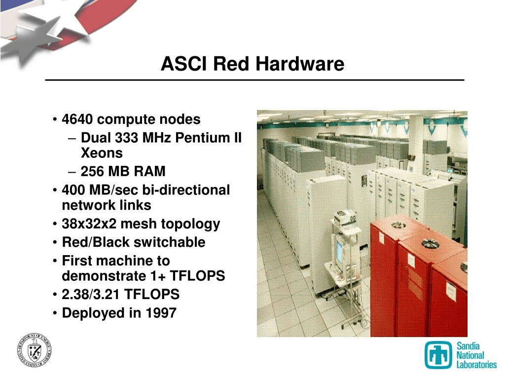 In June of 2006 the ASCI Red supercomputer was disassembled. ASCI Red was the first system to breach the teraflop speed barrier. Before ASCI Red was built, it was widely believed that a trillion calculations per second was an unreachable goal. It was ultimately achieved by linking thousands of processer and memory assemblies called compute nodes into a volleyball court sized system. That $500.00 wonder-box sitting under your TV can process your game at more than twelve teraflops.