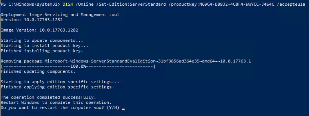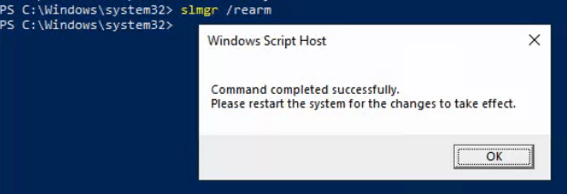 Contrary to some of the posts that I read when I ran into this snafu, the server can be upgraded to a full edition and your key can be applied without re-installing the server’s OS. It’s just a more circuitous route than you would probably like. If you are running low on time, you can extend the evaluation license for another 180 days by re-arming it. In the same administrative PowerShell console run: slmgr /rearm. You will be prompted to reboot.