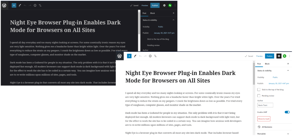 Night Eye is a browser plug-in that converts almost any site into dark mode. That includes browser based applications like the WordPress editor I am using right now. There are several other dark mode browser extensions available and I tried several of them before I settled on Night Eye. One of them really slowed my browser down and another was sending way too much data to an IP in China. Here’s a friendly tech tip, always run a network sniffer after you install an extension!