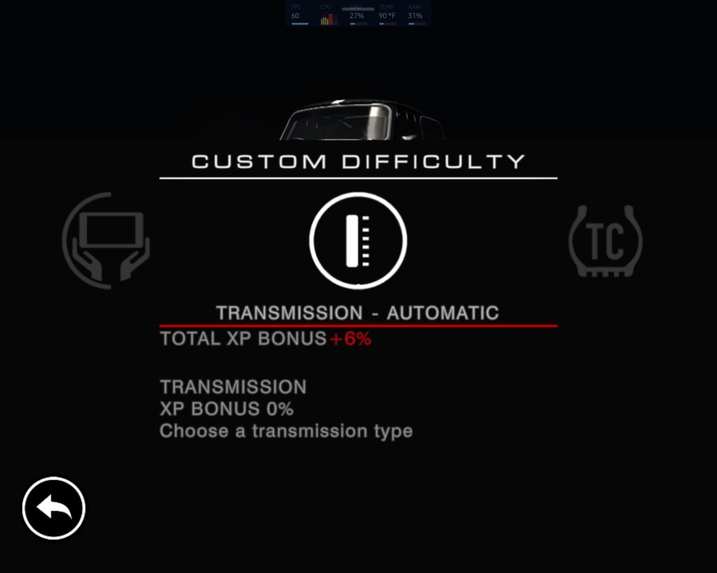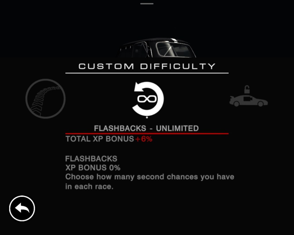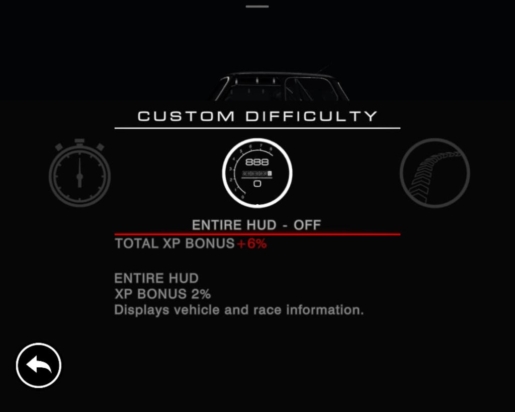 The difficulty options make it easy to tune for your style of driving and skill level. I like to aim for a challenge in which winning appears possible but not probable. There are options for disabling the hud and locking the camera to in-car modes along with turning ideal lines, braking assist, traction control, and others. Besides adjusting how much the game is helping your driving, the AI competition also has its own difficulty levels. When tuning the driving experience, you are increasing or decreasing the XP bonus received for completing the run.