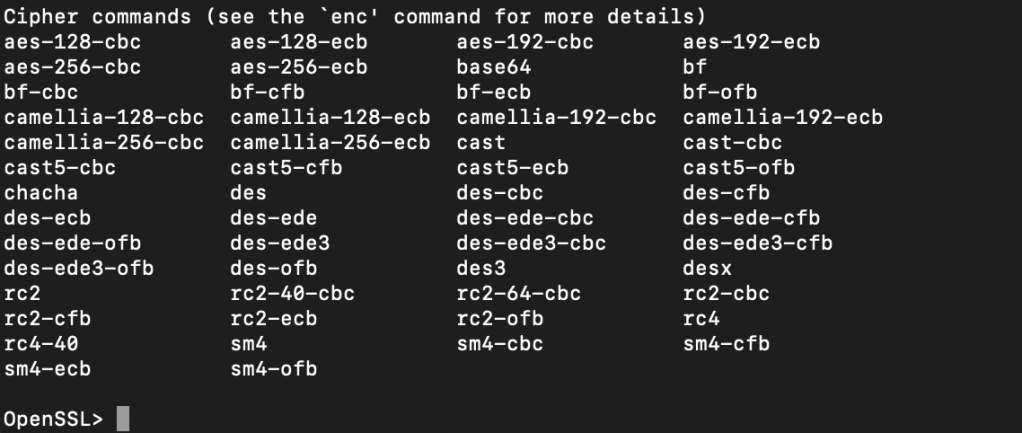 To test the results type “OpenSSL” in the terminal and it should open to a OpenSSL> prompt. Type Help and press enter at that prompt to see a list of OpenSSL commands. Type exit and press enter to leave the OpenSSL session and return to your user prompt.