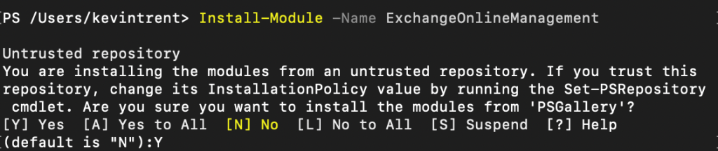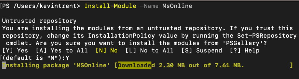 To manage, report on, and incorporate Azure AD objects in your other code, install the MsOnline module with the line below. Again, you’ll need to enter Y when prompted.