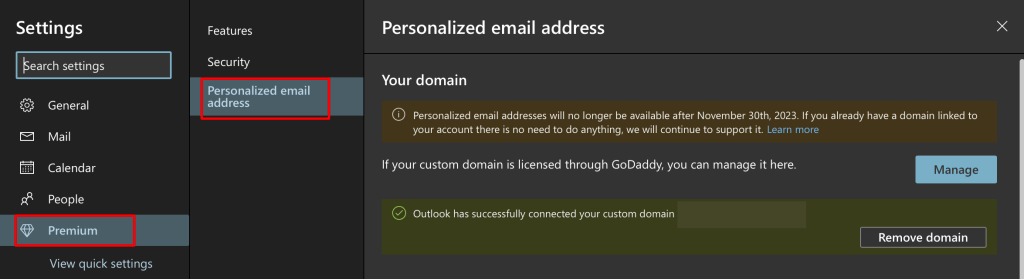 You can read the notification, use the Manage button to sign-in to your GoDaddy account, or set one up if you don’t already have it. Microsoft’s own documentation on the setup, questions, and troubleshooting is where you should turn for the rest of the configuration. They’ve made the process fairly simple, it took me about forty-five minutes to get my custom email addresses fully working on the Internet. If you complete the setup process before the deadline, your custom email address will not stop working.