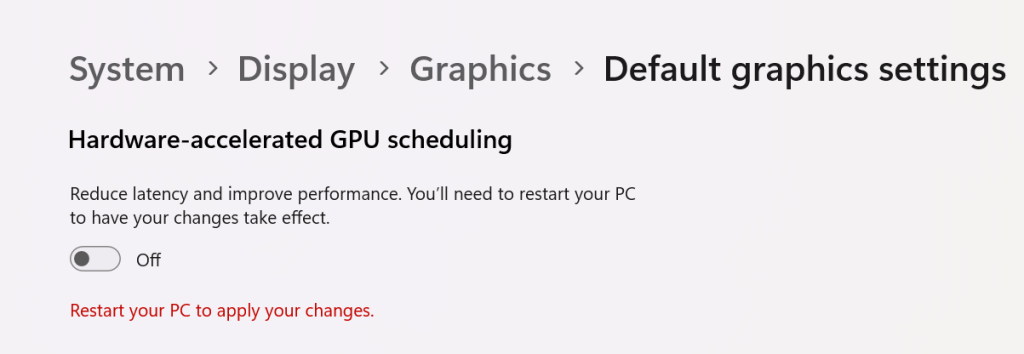Go to Settings -> System -> Display -> Graphics and click Change Default Graphics Settings. Then disable Hardware-accelerated GPU scheduling by sliding the toggle to the off position. You will need to restart your computer for the change to take effect.