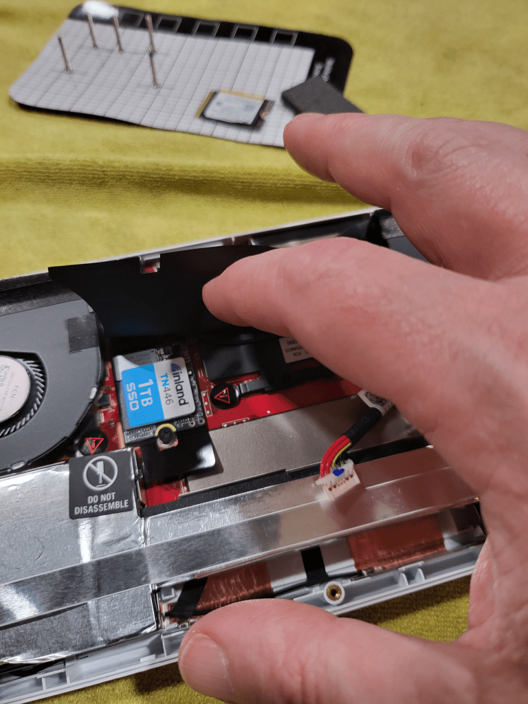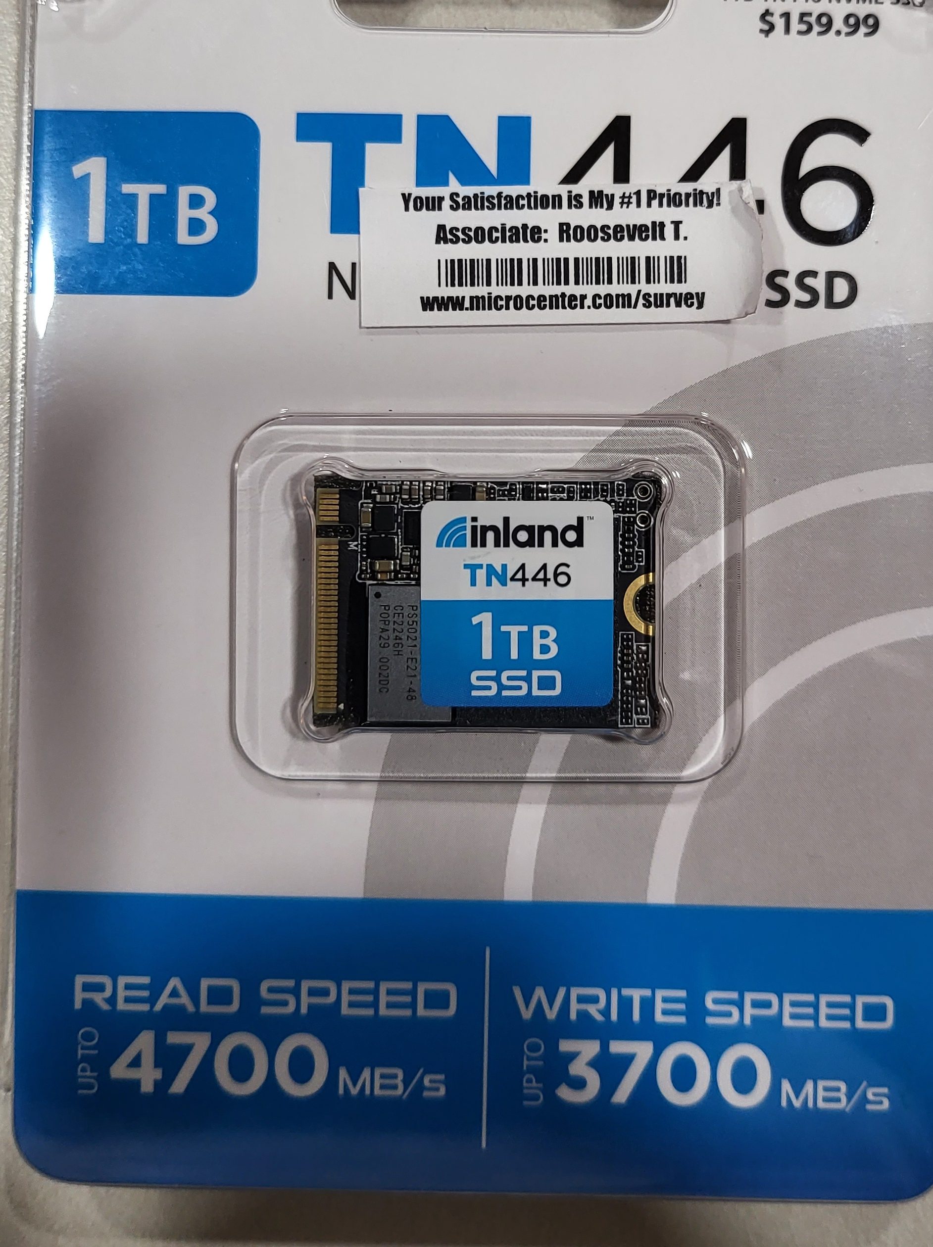 I picked up an Inland 1TB M.2 2230 SSD at my local Microcenter store for $109.00 on sale. I would have preferred to go with 2 TB but those are hard to find and I didn’t want to wait any longer. If you are not familiar, the 2230 designates the length (short in this case) of the disk. Make sure you are getting the compact size SSD, regular or long disks will not fit in the case.
