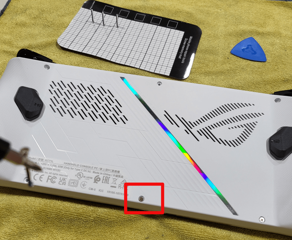 I just followed the ASUS guide carefully. I suggest that you watch the embedded YouTube video. One of their technicians goes through the entire process step by step. With the Ally lying face down, top edge of the device (exhaust ports) away from your body, on a soft surface in front of you, the middle screw in the bottom row is captive. It will not fully unscrew from the case. Instead, it will make a clicking sound and assist in splitting the case halves apart when it is fully unscrewed. The other five screws are all fully removable.
