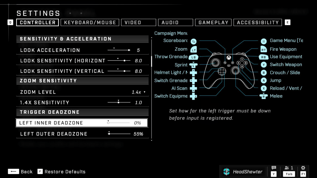 Some tips for those playing on an Ally. I set both joystick dead zones to zero. I also turn up all the look sensitivities to the middle of their scales. I make these changes in Halo’s settings menu. In the Ally’s controller profiles menu (auto-mode), I map the rear buttons to sprint and melee.