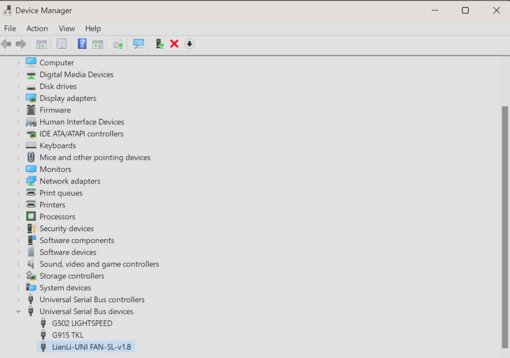 I glanced through device manager then checked for updates in every conceivable place, and finally rebooted again. Nada, the lights and fans still all turned on. Anything connected to the Lian Li controller was stuck in Rainbow glow mode with the fans spinning at what sounded like approximately about one-fourth of their maximum speed.