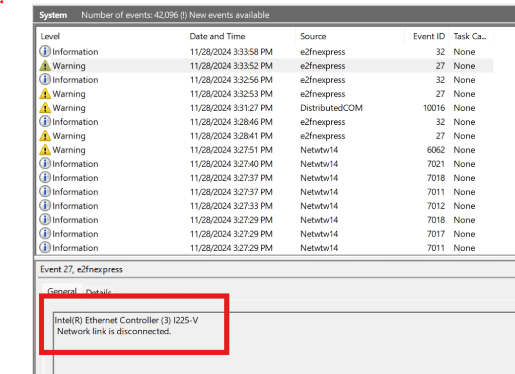 After I found the event 27 and read its description, “Network link is disconnected” I considered the situation. I had not unplugged my network cable, and I know my network is pretty solid. So rather than go down the network troubleshooting route, I decided to try a clean install of the driver.
