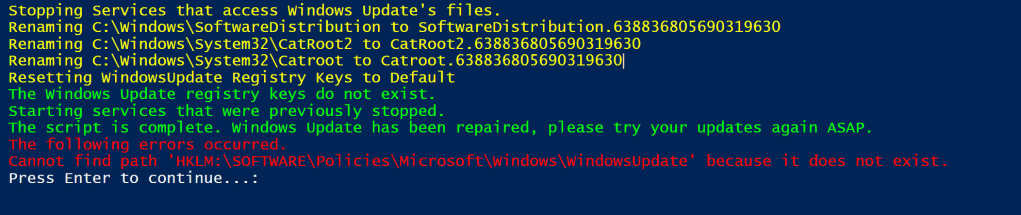 Write-Host -ForegroundColor Green "The Windows Update registry keys do not exist."