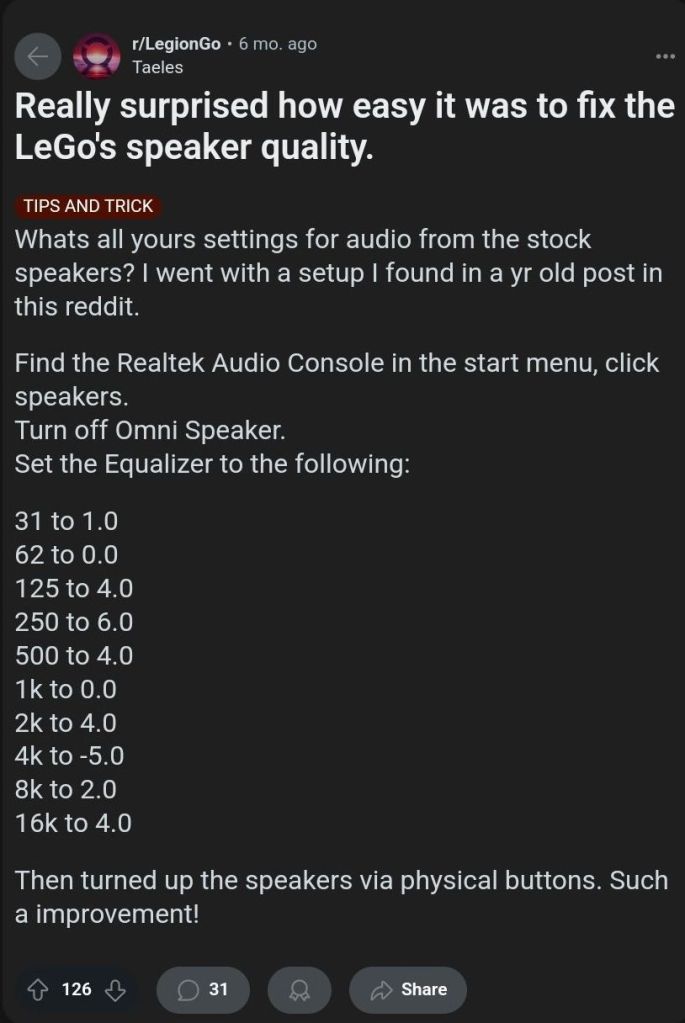 If you research the topic of poor sound, you’ll see there are several software workarounds that help considerably. The easy/free method is to use the Realtek Audio Console. Open it from the Start Menu to toggle off a feature called the “Omni Speaker”. Then use the same software to adjust the equalizer frequencies. Find this idea and lots of others at: https://www.reddit.com/r/LegionGo/
