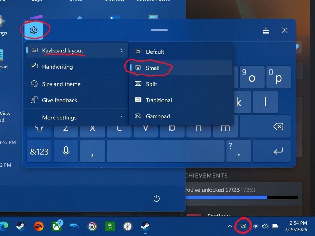 Open the keyboard by touching or clicking the icon for it near the clock on your taskbar. Click or tap on the settings gear in the upper left corner of the keyboard’s panel. Then select Keyboard Layout from the menu and click small. Now you can use the little dash at the top of the OSK to drag it out of your way!
