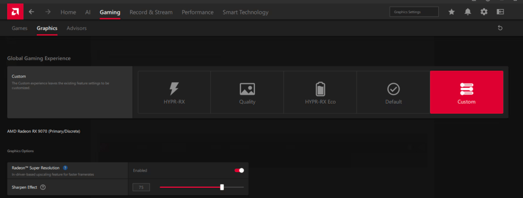AAA titles can run in the 60-110 FPS range with good fidelity once you learn to tune and upscale them. I haven’t written a comprehensive guide to upscale games yet, but the basics are easy. Open the AMD Adrenaline app and turn on the scaling options.