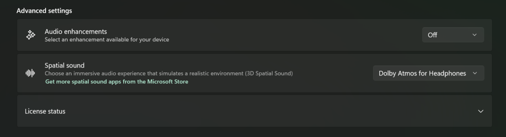 For Dolby Access, or any spatial sound app to be the most effective, disable Window’s sound enhancements. Go to Settings -> System -> Sound and click on the speakers. Advanced -> Audio enhancements toggle off.