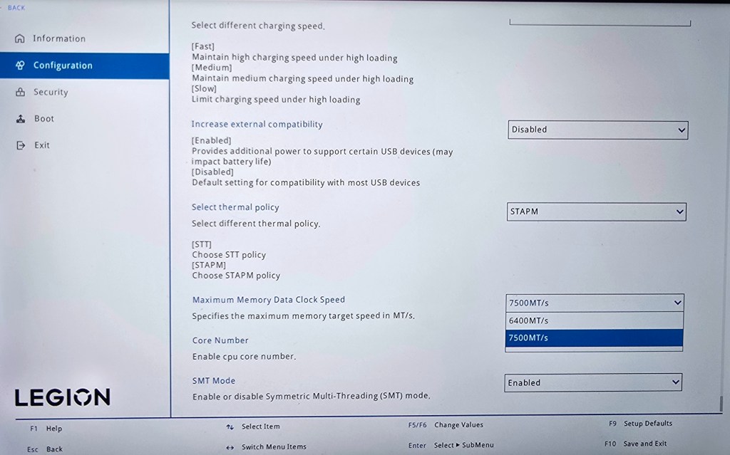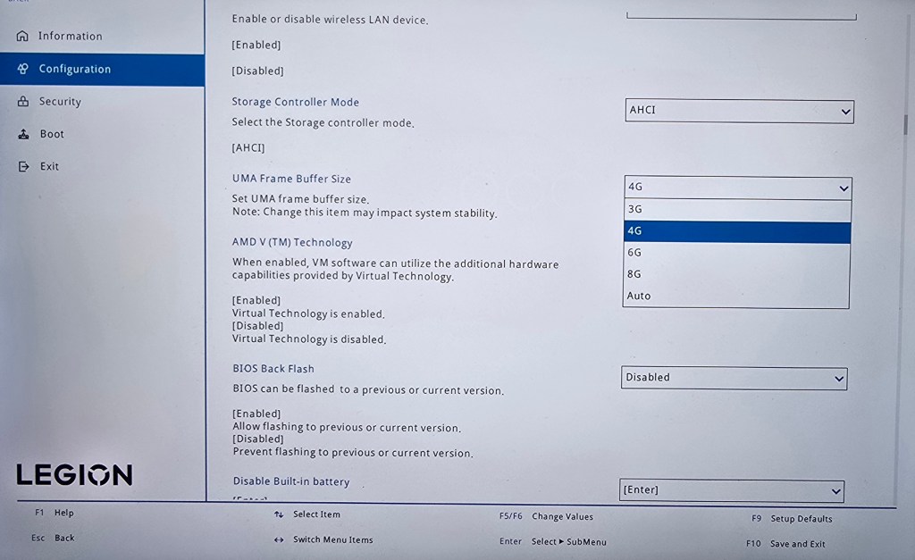 In the Legion Go’s BIOS there are two settings we can adjust that effect game performance. The first is how much of the system’s 16 Gigabytes of RAM is reserved to support the GPU. By default, 3 GB of VRAM is selected but this can slow some games down. I get better performance and game stability with 4 GB assigned to graphics processing. That leaves 12 GB for Windows and your game, which is plenty in most cases.