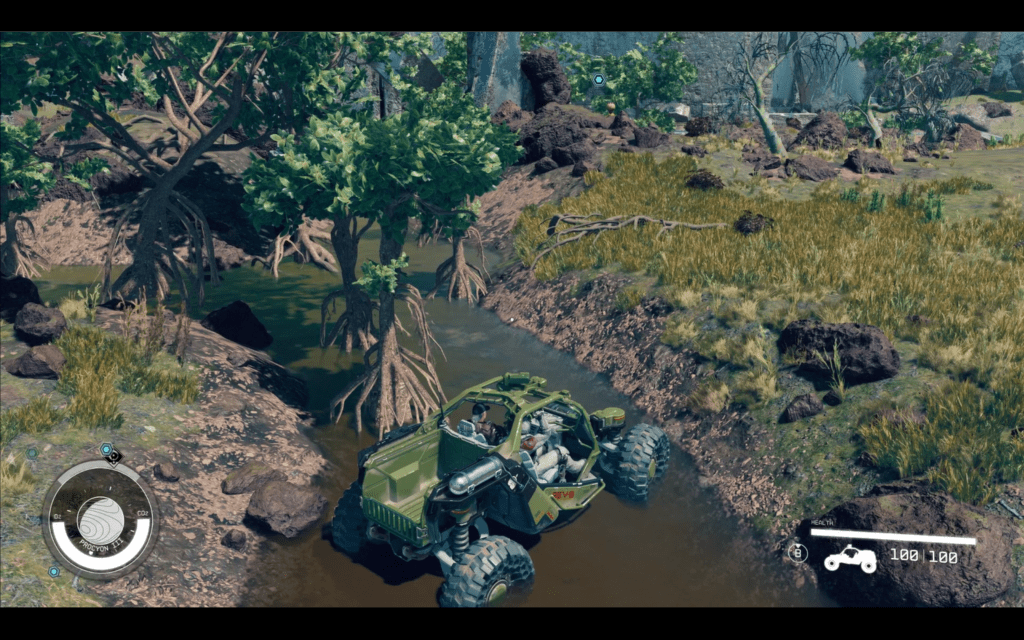 Then there’s your ground transportation. The addition of the REV-8 ground vehicle is most welcome. The off-road machine features jet pack hover/jumping of its own. It also has a turbo boost and a canon. The canon requires accuracy to be effective, but once you get it dialed in, watch out baddies. I’ve devastated entire enemy strongholds with my REV-8. It reminds me of the Mako from Mass-Effect in a lot of ways. The jumping feature is extremely useful and can be cheesed to great effect if you like to play that way.
