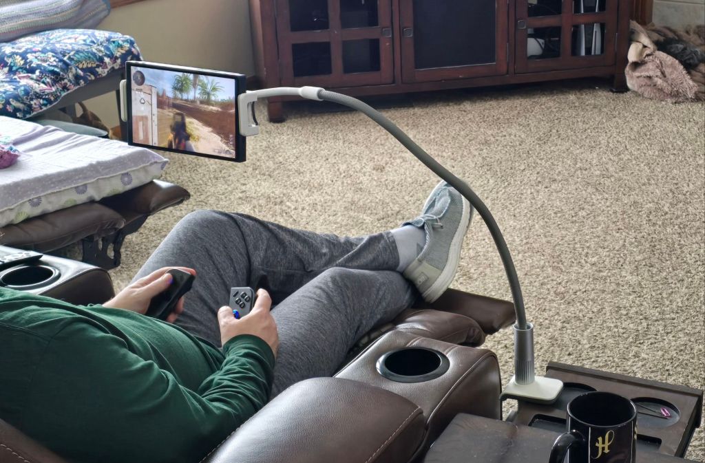 Speaking of controllers, the Go’s are removable a la’ the Nintendo Switch. I can not overstate how much of an advantage in ergonomics this design is. I have a “gooseneck mount” that I put the display in. It holds my screen in the perfect position, even in bed. Then, I remove the controllers and am able to keep my arms and hands in natural positions instead of crossing my body.