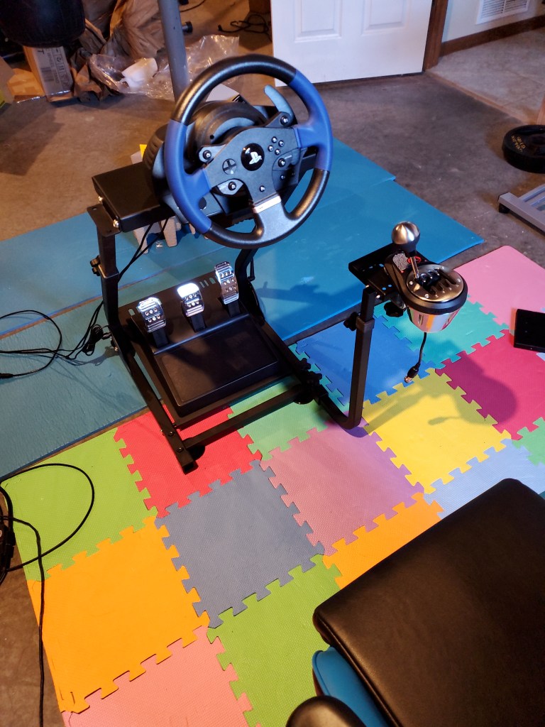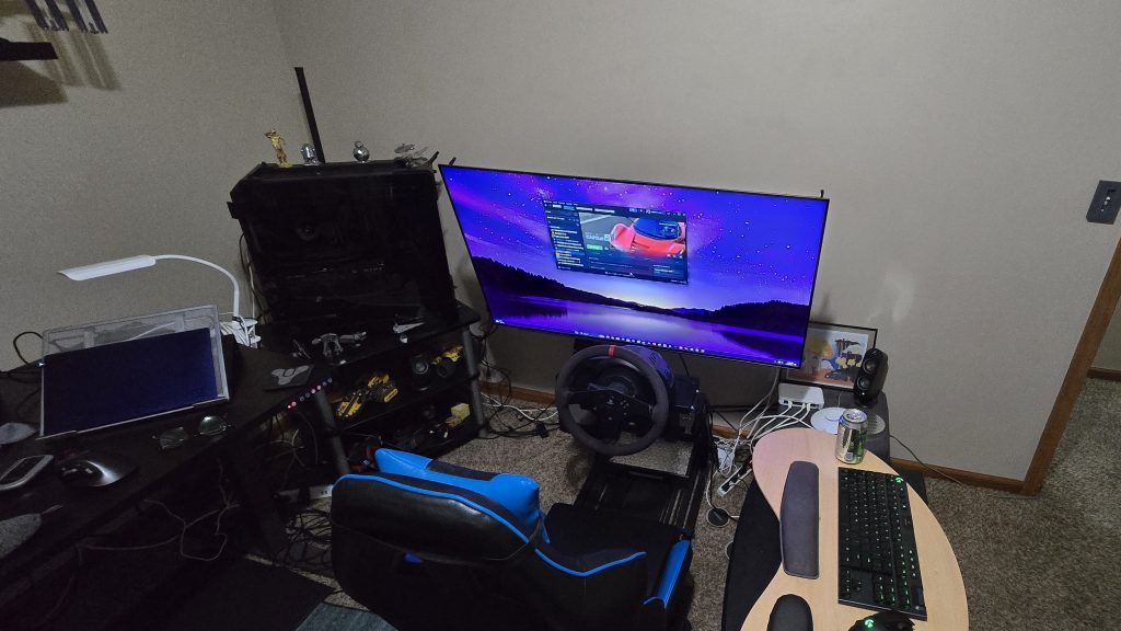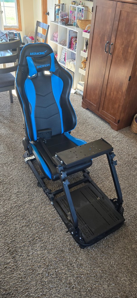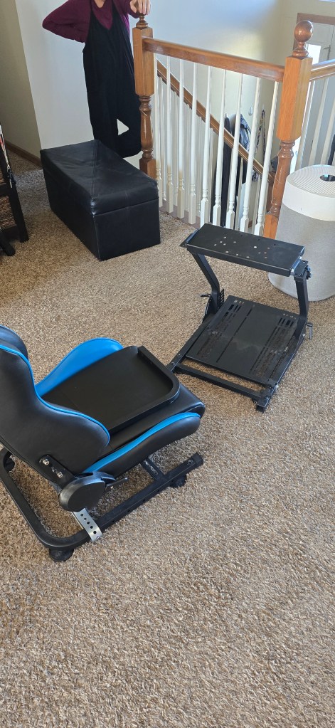 The DIY simulator worked. I used it for more than a year. But… there were problems. It wasn’t very comfortable for one. The chair and wheel being on separate frames meant they didn’t line up perfectly. They weren’t quite the correct height for each other either. The wall mounted screen made achieving the ideal distance between it and the wheel a problem.