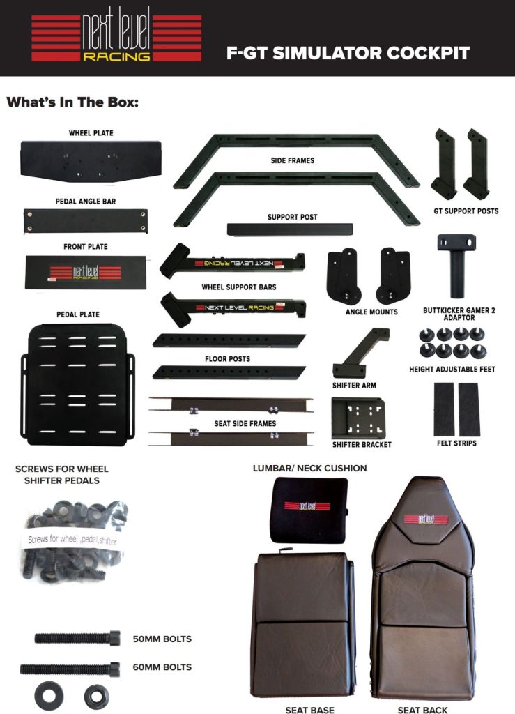 I bought the F-GT, the HOTAS mounting kit, and the optional monitor stand. The unit includes a built-in seat. I already had the PC, monitor, wheel, pedals, and speakers.