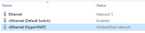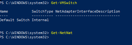 Windows 10 has built-in port forwarding and NAT mapping. Normally you would need a few lines of PowerShell to forward the packets to your VM, but there’s a problem. The Hyper-V default switch’s NAT is not exposed to the OS. If you open PowerShell and run Get-NetNat you will probably see no return (assuming you haven’t configured other NAT mappings). We need to create a virtual switch that uses NAT and allows us to control it. Microsoft has not included this functionality in the GUI, but it can be done.