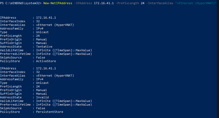New-NetIPAddress –IPAddress 172.16.41.1 -PrefixLength 24 -InterfaceAlias "vEthernet (HyperVNAT)"