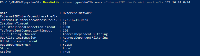 New-NetNat –Name HyperVNATNetwork –InternalIPInterfaceAddressPrefix 172.16.41.0/24
