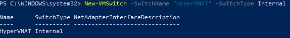 New-VMSwitch –SwitchName “HyperVNAT” –SwitchType Internal