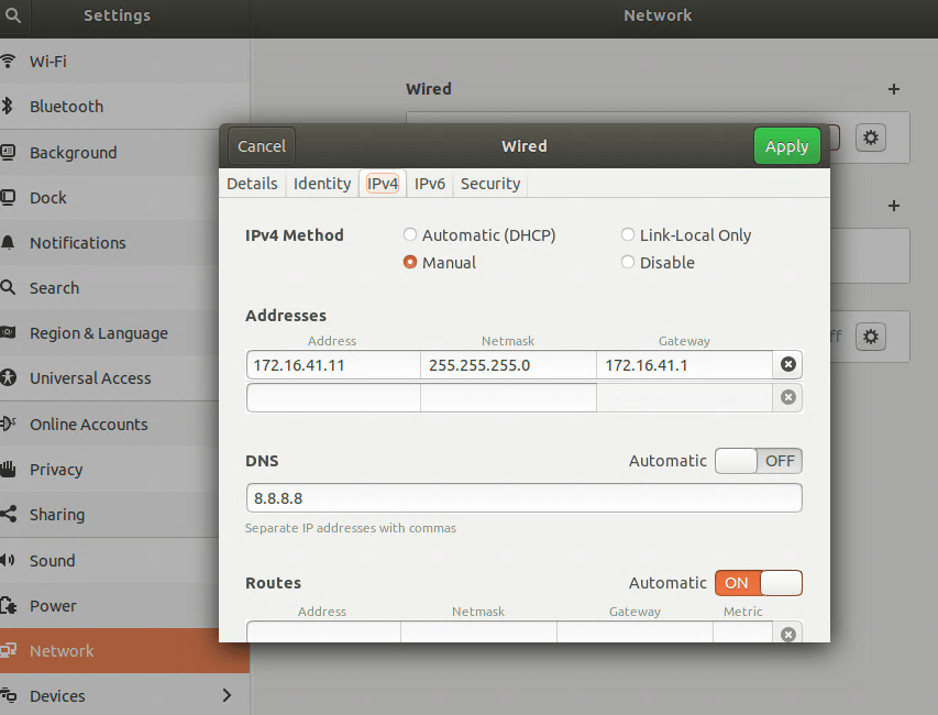 There are numerous ways to configure the IP information for a computer. They all differ according to the operating system. Generally, somewhere in the settings of your OS should be the network options. Set the IPv4 interface to manual (not automatic or DHCP) and enter the correct numbers for each. Below I’ve configured an Ubuntu Linux machine for the network we’re creating in this post.